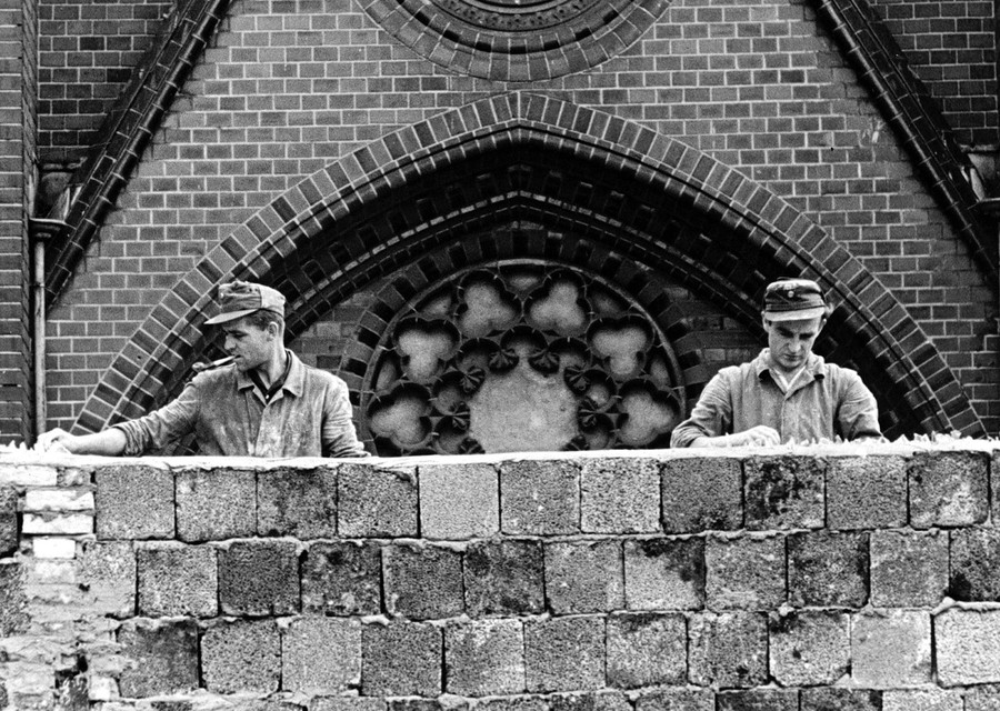 Read moreA young East Berliner erects a concrete wall that was later topped by barbed wire at a sector border in the divided city August 18, 1961. East German police stand guard in background as another worker mixed cement. #