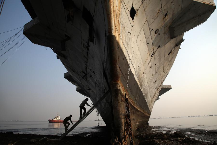 Read moreWorkers climb to enter India's first aircraft carrier INS Vikrant to dismantle it at a ship-breaking yard in Mumbai, India, on November 22, 2014. The iconic naval vessel, that was purchased from Britain in 1957, played a key role during the India-Pakistan war of 1971 and was decommissioned in 1997. #