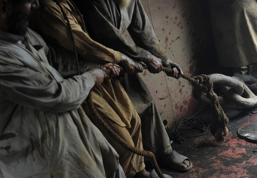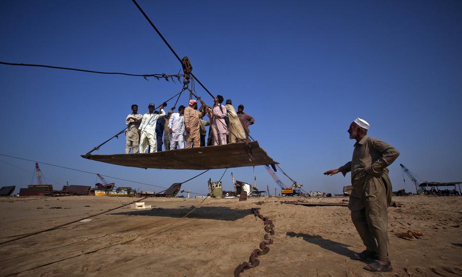 Read morePakistani shipyard workers pull together on a chain helping to secure a platform in a vessel beached and being dismantled at one of the ship-breaking plots in Gaddani, Pakistan, on July 11, 2012. #