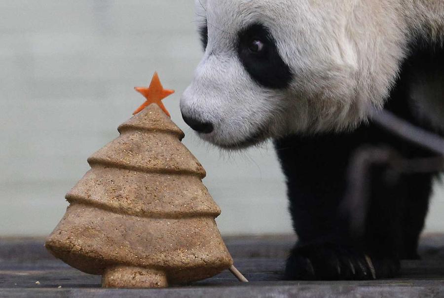 Read moreTian Tian, a giant panda prepares to eat a special Christmas panda cake crafted in the shape of a Christmas tree in the outdoor enclosure at Edinburgh Zoo, Scotland, on December 17, 2014. #