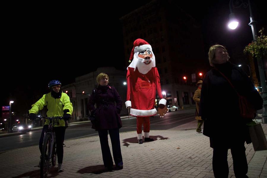 Read moreTownspeople and a giant Santa Claus created by local artist Ed Terrell, attend a ceremony to decorate a scraggly Christmas tree in Reading, Pennsylvania, on December 7, 2014. A ceremony to decorate the scraggly Christmas tree in Reading with a single red bulb, much like Charlie Brown's tree in the animated holiday classic, was postponed because of rain and cold temperatures, officials said. #
