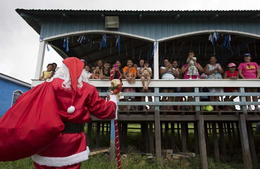 Read moreA member of the Amigos do Papai Noel (Friends of Santa Claus group) dressed as Santa Claus talks to children before giving out gifts to them at the community Sao Jose in Careiro da Varzea of Amazonas State, located along the Amazon River bank where the Ribeirinhos (forest dwellers) live, on December 20, 2014. The volunteers of Friends of Santa Claus group have been distributing Christmas gifts to people living in the area since 1998. #