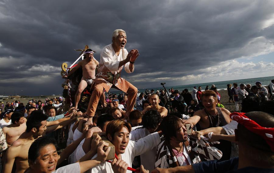 Read moreMen ride on a "mikoshi" or portable shrine as local people carry it into the sea during a festival to wish for calm waters in the ocean and good fortune in the new year in Oiso, west of Tokyo, on January 1, 2015. #