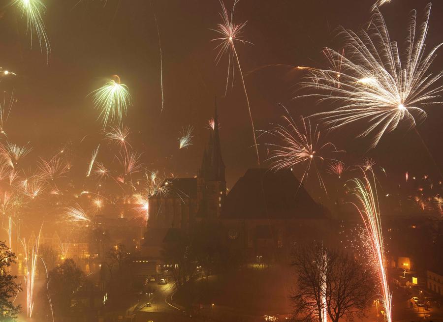Read moreFireworks light the sky above the medieval Mariendom (Cathedral of Mary), left, and the St. Severi's Church, right, shortly after midnight during New Year's Eve celebrations in Erfurt, Germany, on January 1, 2015. #