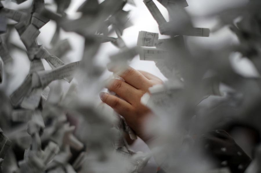 Read moreA visitor ties on her written oracle after praying for good luck during "hatsumode" or the first visit of the year at Kawasaki Daishi Temple in Kawasaki near Tokyo, on January 1, 2015. #