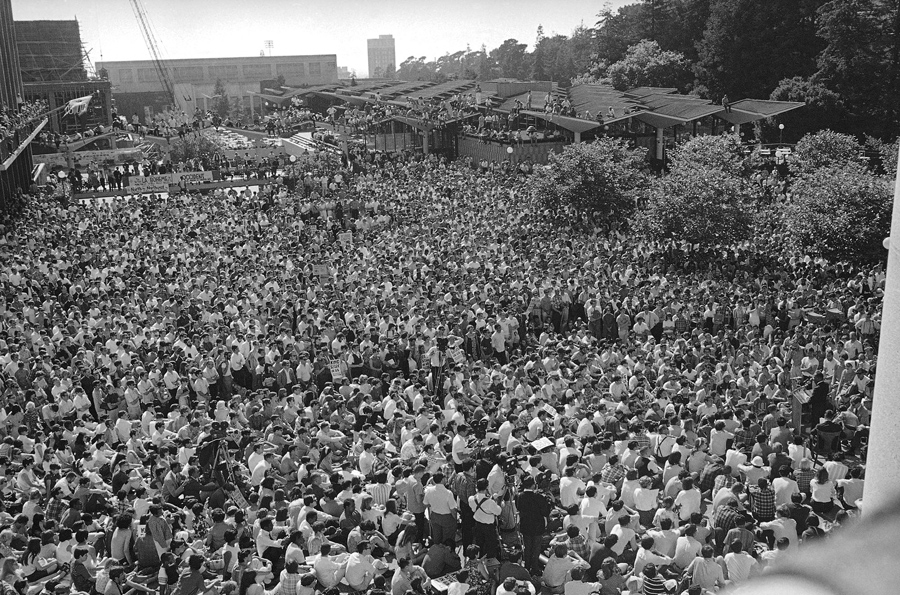 Read moreA large portion of the estimated 5,000 who attended Dr. Martin Luther King's speech from Sproul Hall, University of California administration building in Berkeley, California, listening intently on May 17, 1967. In the speech, King reiterated his stand for non-violence and urged that young people support a peace bloc that would influence the 1968 elections. #