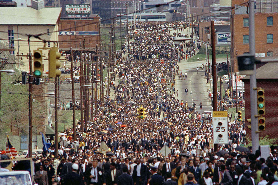 Read moreTwo men, one black and one white, join hands as they sing during a solemn tribute to Dr. Martin Luther King Jr. in Minneapolis, Minnesota, on April 9, 1968. Between 3,500 and 4,000 people, black and white, gathered in a downtown Minneapolis park for the service which coincided with the funeral in Atlanta. #