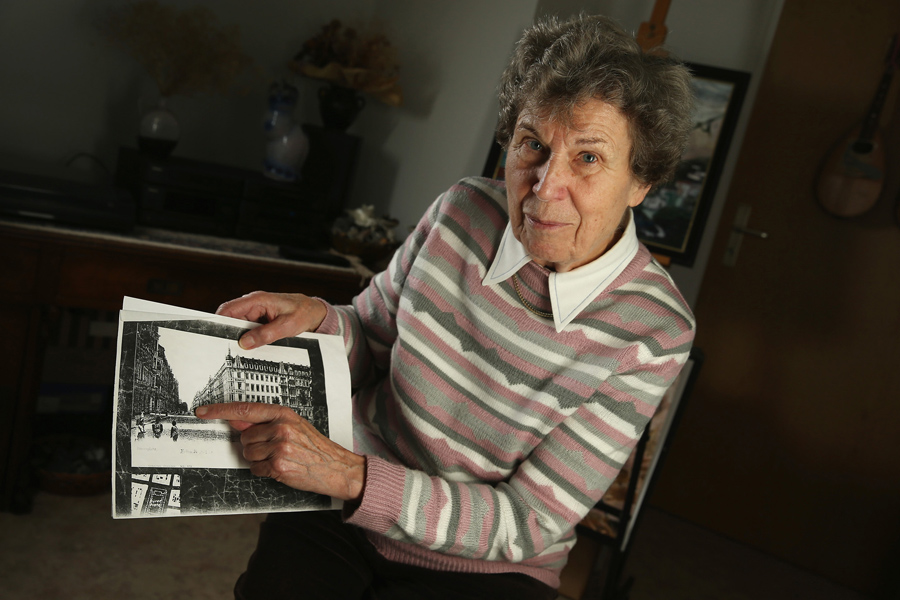 Read moreAnita John, 82, who survived the February 13, 1945 firebombing by Allied planes of the city of Dresden, points to where she lived in a photograph showing her street before the raids in a photo taken on February 10, 2015 in Dresden, Germany. She says that when she and her parents went to the cellar to take shelter during the raids her mother lay over her to protect her, and that only she survived. All 13 others, including her parents, suffocated. Anita says that when she emerged she did not know what had happened, and only realized her parents were dead when she found their bodies among so many others the next day, laid out in the street before the rubble of her former home. #