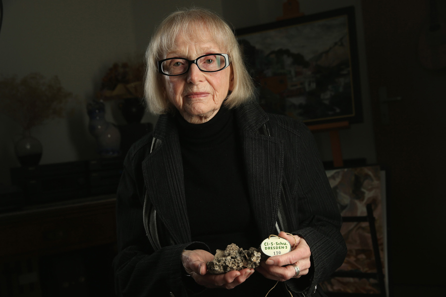 Read moreAini Teufel, 81, who survived the February 13, 1945 firebombing by Allied planes of the city of Dresden, poses holding a molten remain of her elementary school and the original identification tag she had to wear at school in case she might die in an air-raid in a photograph taken February 10, 2015 in Dresden, Germany. "The clouds saved my life" ("Die Wolken haben mein Leben gerettet"), she says of clouds that forced Allied bombers to delay their attack on the city of Dresden from daytime into the night of February 13, 1945. Aini's school was obliterated in the raid and she is certain she would be dead if the planes had attacked during the day when she was at school. #