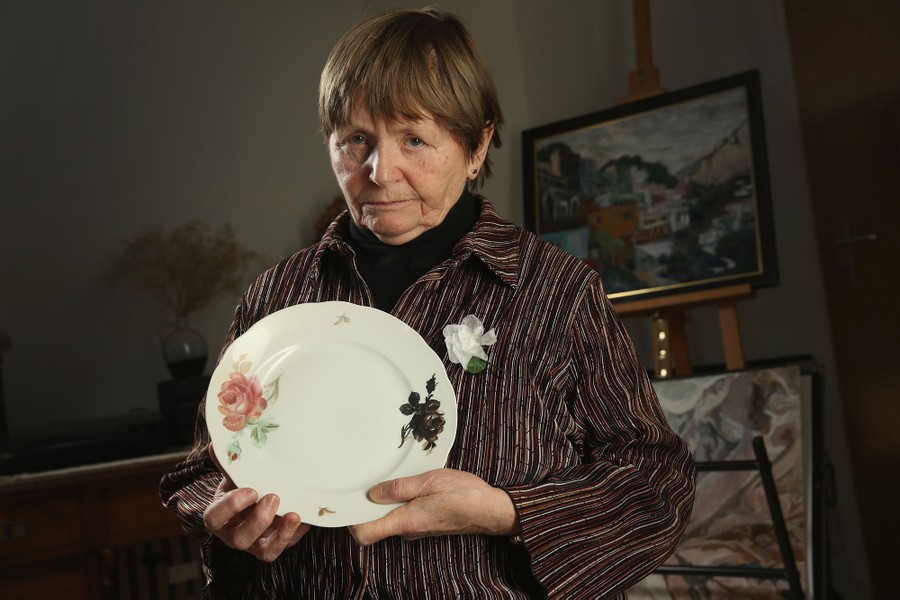 Read moreNora Lang, 83, who survived the February 13, 1945 firebombing by Allied planes of the city of Dresden, holds a plate on which one of the painted roses turned black from the heat of the fire in a photo taken on February 10, 2015 in Dresden, Germany. Nora's father rushed items from their apartment to the cellar in between successive raids and the plate is one of the few items that survived. "Behind us everything was burning, in front of us everything was burning." ("Hinter uns brannte alles, vor uns brannte alles.") she says of what she saw in her neighborhood after she emerged from a bomb shelter following the raids. #