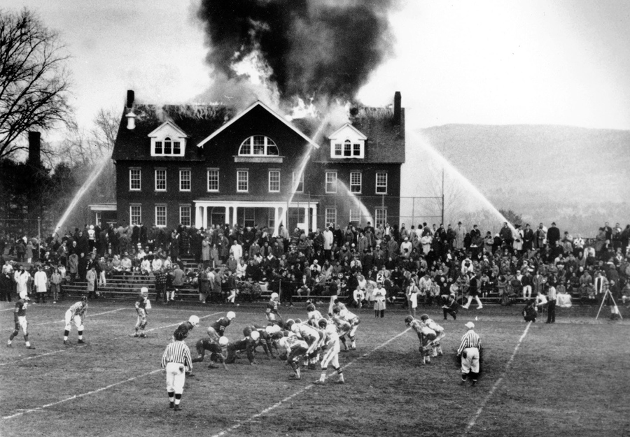 Read moreSpectators divide their attention as the Mount Hermon High School football team in Massachusetts hosts Deerfield Academy during a structure fire in the Mount Hermon science building on November 24, 1965. The science building was destroyed, and Mount Hermon lost the football game, ending a two-year-long winning streak. #