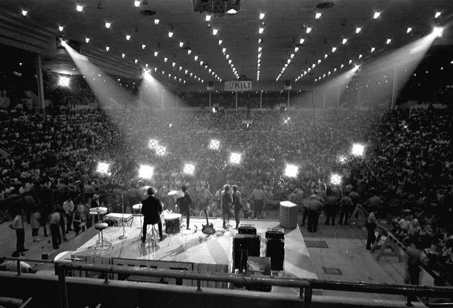 Read moreThe Beatles are shown as they played to a screaming crowd in Houston's Coliseum on August 19, 1965. White spots are flashbulbs from the many fans who took pictures during the show. #