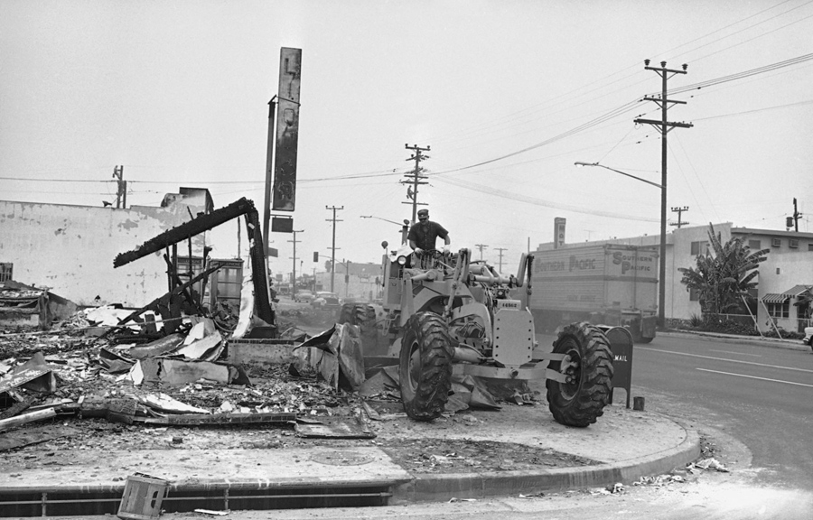 Read moreThe massive job of cleaning up the black section of Los Angeles through which riots surged for five days gets underway as a bulldozer clears debris from a fire-gutted store off the sidewalk in Watts, Los Angeles, August 18, 1965. #