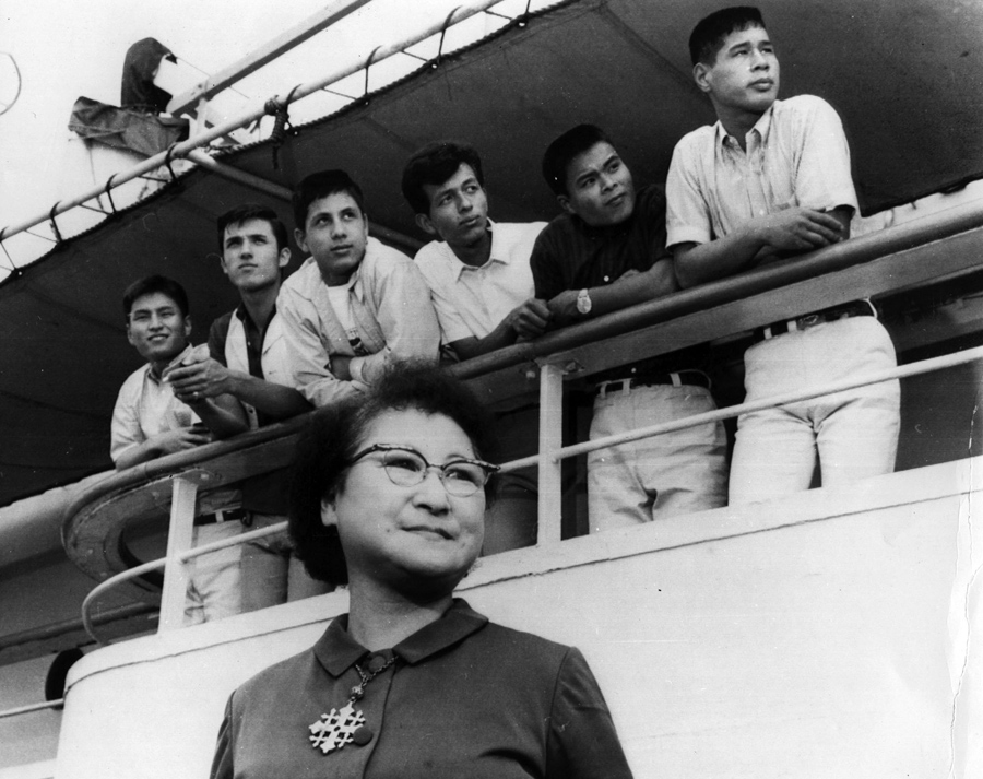 Read moreMrs. Miki Sawada, the granddaughter of the founder of the Mitsubishi industrial empire in Japan, poses in Los Angeles with six of her now-grown "GI babies," who are heading for a new life in Brazil. They stopped briefly in Los Angeles on the trip from Japan on July 22, 1965. They are the abandoned children of American soldiers and Japanese girls, disliked by Japanese because of their mixed ancestry. #