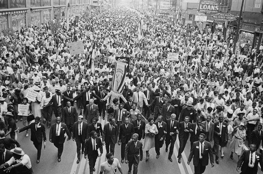 Read moreMartin Luther King Jr., center foreground, walks in vanguard of a crowd estimated at more than 10,000 persons who gathered in downtown Chicago, on July 26, 1965, to protest segregation in the city's schools. #