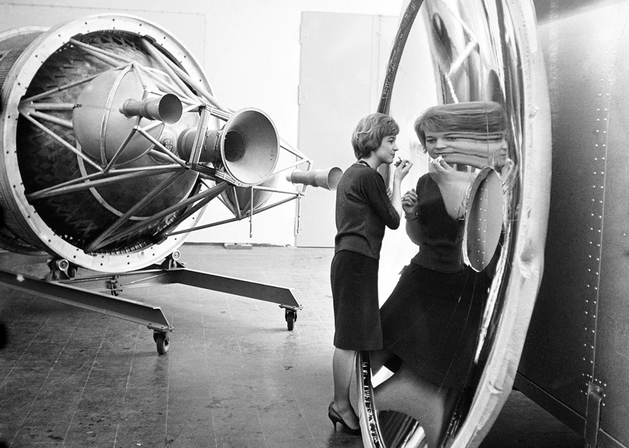 Read moreA woman touches up her lipstick with the help of a huge parabolic mirror which is part of the West German research satellite, 625-B, being assembled in a plant in Munich, West Germany, on February 26, 1965. The mirror is a component of the unit's heat engine, concentrating solar radiation onto the absorber of a generator. #