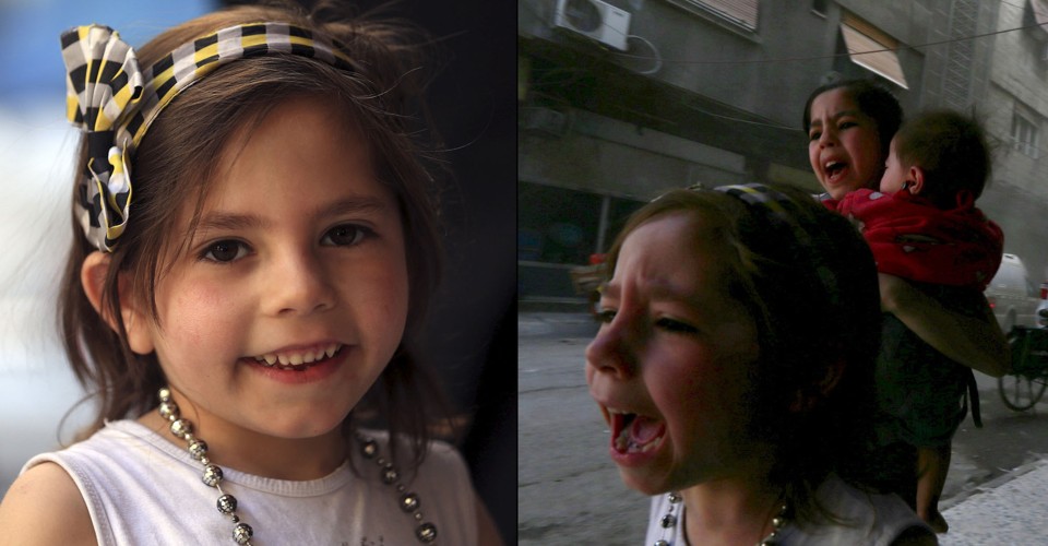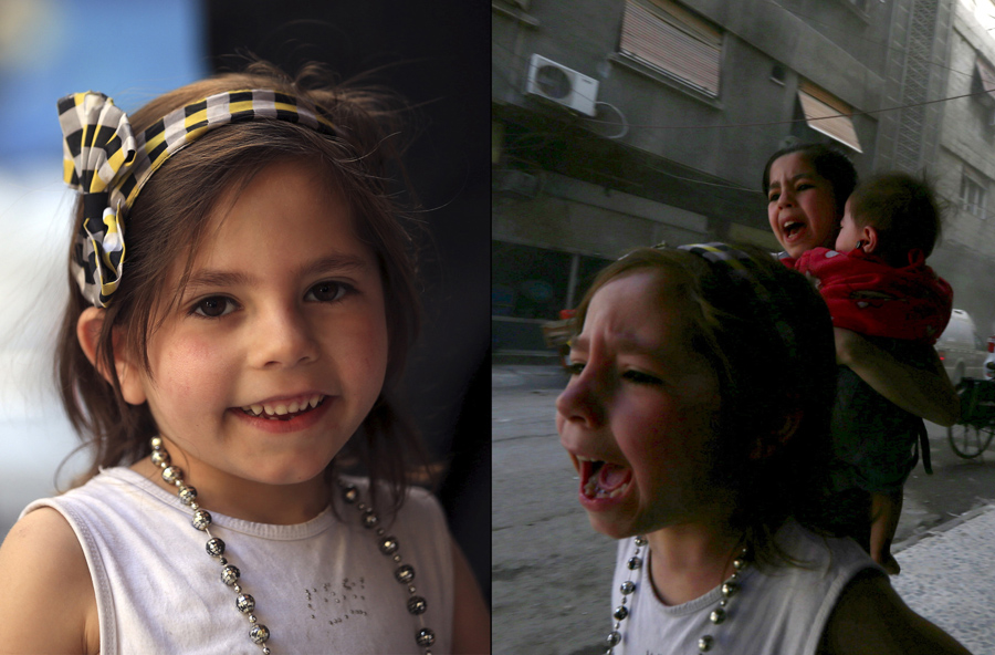 Read moreAt left, Ghazal, 4, poses for the photographer along a street near the Syrian Arab Red Crescent center in the Douma neighborhood of Damascus, minutes before what activists said was a shelling by forces of Syria's President Bashar al-Assad on May 6, 2015. At right, Ghazal runs from the explosion with her sister Judy, 7, who was carrying an 8-month-old named Suhair. #