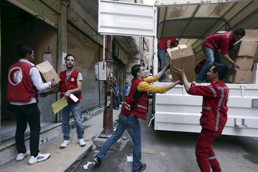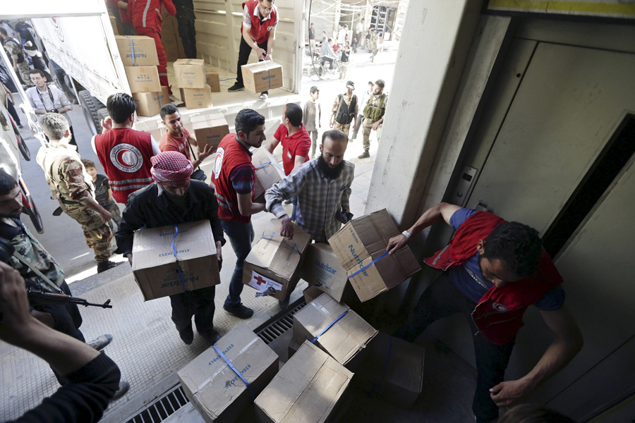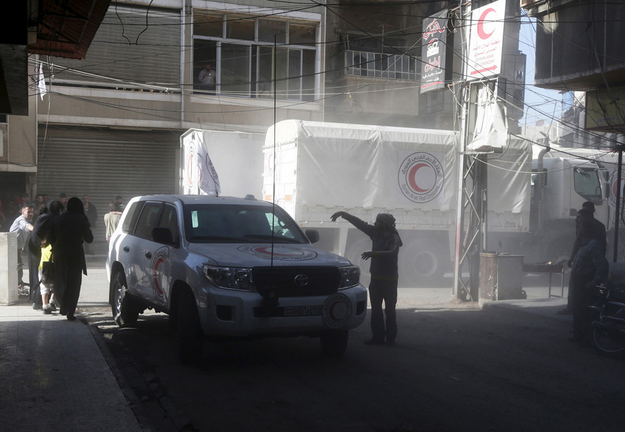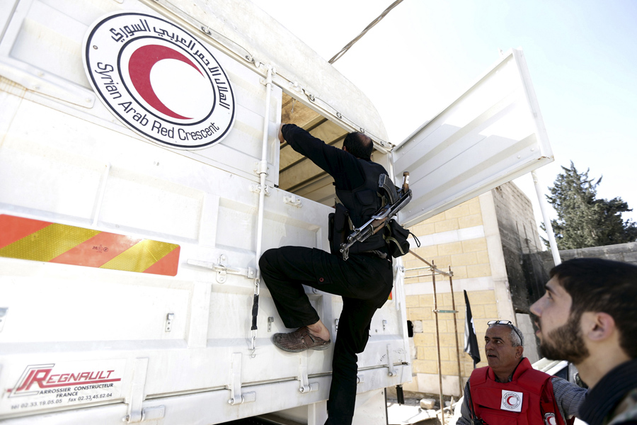 Read moreRebel fighters walk past a Syrian Arab Red Crescent convoy carrying medical and humanitarian aid to be distributed in the Douma neighborhood of Damascus on May 6, 2015. #