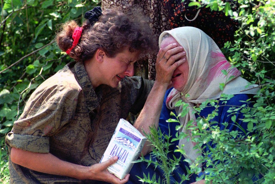 Read moreAn unnamed woman and her mother, refugees from Srebrenica, cry together because they don't know what happened to the rest of their family, at a U.N. base 12 kilometers south of Tuzla, Bosnia and Herzegovina, on July 13, 1995. The woman holds a carton of mineral water in her hand supplied by the U.N. #