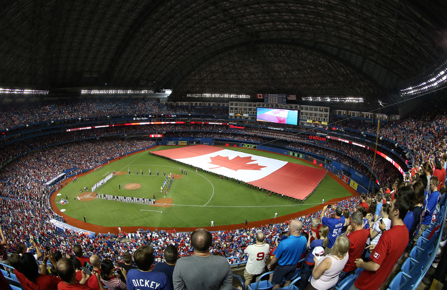 Read moreZ requested an image of “Canada Day.” In Toronto, a large Canadian flag is unveiled on the field on Canada Day before the start of the Toronto Blue Jays baseball game against the Boston Red Sox on July 1, 2015 at Rogers Center. #