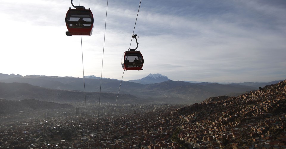 The city of La Paz, Bolivia, has long struggled with transportation issues. Steep terrain, high density, and narrow streets have resulted in years of traffic nightmares for fleets of minibuses and private taxis. In the past two years, the government has worked to alleviate this by building the largest urban cable-car system in the world. Currently La Paz has three urban ropeway lines in operation, stretching over 10 kilometers, with plans to triple the size of the network. The city recently announced six new lines, which will extend the aerial system to 30 kilometers and carry up to 27,000 passengers an hour.