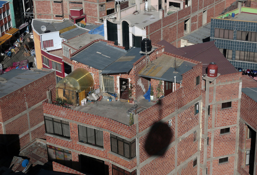 Read moreThe shadow of a cable car falls on a building in the Chijini district of La Paz, as it travels past on July 23, 2015. #