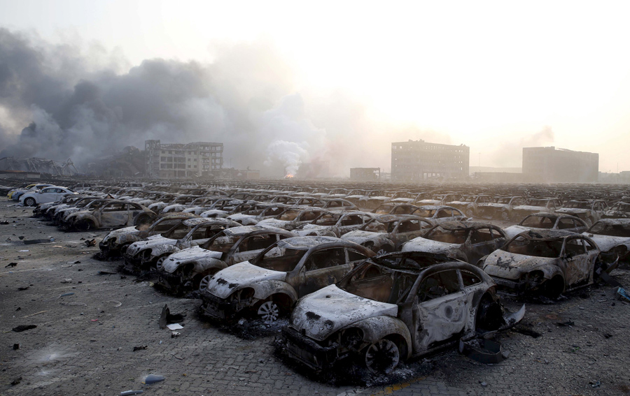 Read moreRows of cars are burned after the explosions at a warehouse in Tianjin on August 13, 2015. #