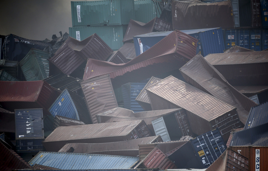 Read moreCrushed and overturned containers are seen near the explosion site in Tianjin on August 13, 2015. #