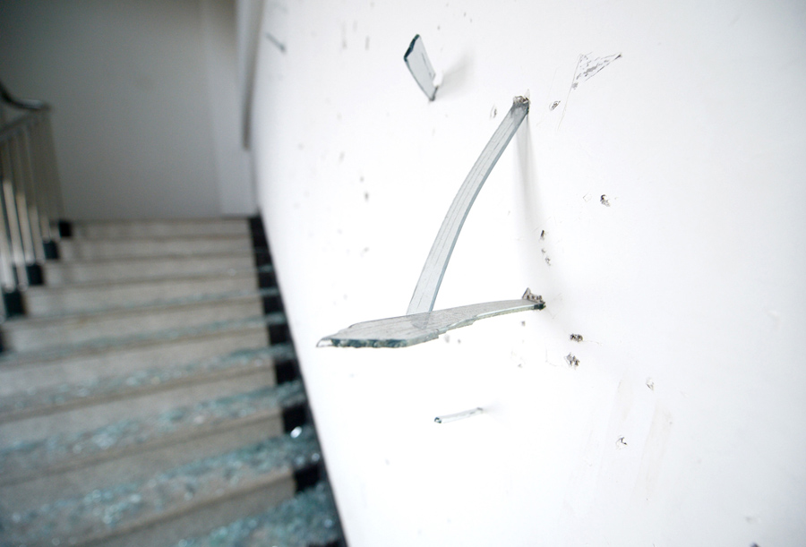 Read moreShards of window glass remain embedded in the wall of a stairway in a building near the explosion site in Tianjin on August 13, 2015. #