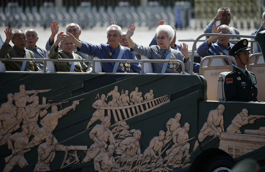 In Beijing, China marked the 70th anniversary of the end of World War II, and its role in defeating Japan, by holding an enormous military parade and declaring a new national holiday. The spectacle involved more than 12,000 troops, 500 pieces of military hardware, and 200 aircraft of various types, representing what military officials said were the Chinese military's most cutting-edge technology. While the entire event was a show of strength, Chinese officials insisted the message was about peace, with the logo displayed on posters featuring an image of a dove.