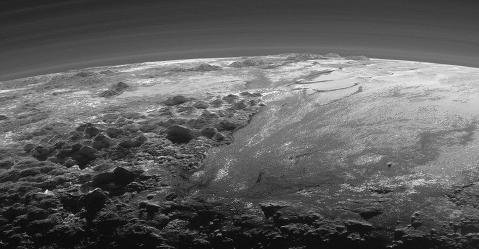 Images from NASA’s New Horizons spacecraft just released today show a backlit mountainous panorama of Pluto, displaying an amazing icy landscape never before seen by humans. Just 15 minutes after its closest approach to Pluto on July 14, 2015, the spacecraft looked back toward the sun and captured this near-sunset view of icy mountains reaching heights of 11,000 feet above flat ice plains extending to Pluto’s horizon.