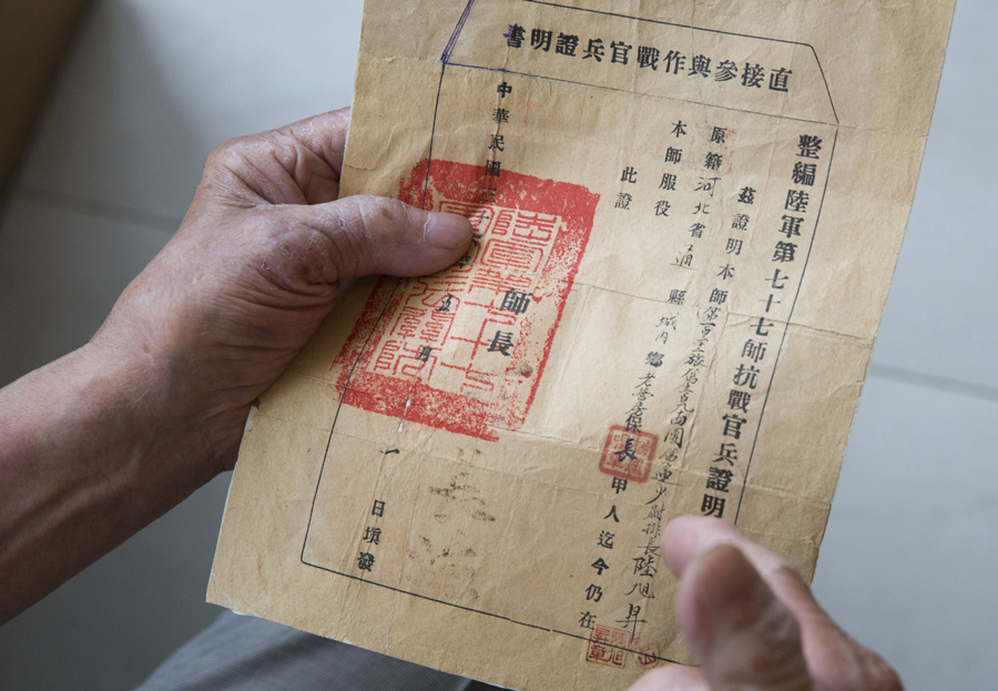 Read moreChinese veteran Lu Chunshan, 91, holds up a certificate detailing his wartime service during an interview at his home in Beijing on August 30, 2015. Following the war, Lu found temporary employment, but was dragged before baying crowds during political campaigns in the 1950s and 1960s and denounced as an enemy of the Communist cause. “If you tangled with the Communists, then it was as if you made no contribution at all to speak of,” Lu said. “If you did just what the party said, you’d have a good life.” Despite having faded documentation confirming his national service, Lu receives no pension, surviving mainly on the 2,400 yuan ($380) per month provided by a former employer, a state oil company. China announced in 2013 that KMT veterans were now eligible for state pensions, but the government has yet to locate and verify all that still survive. #