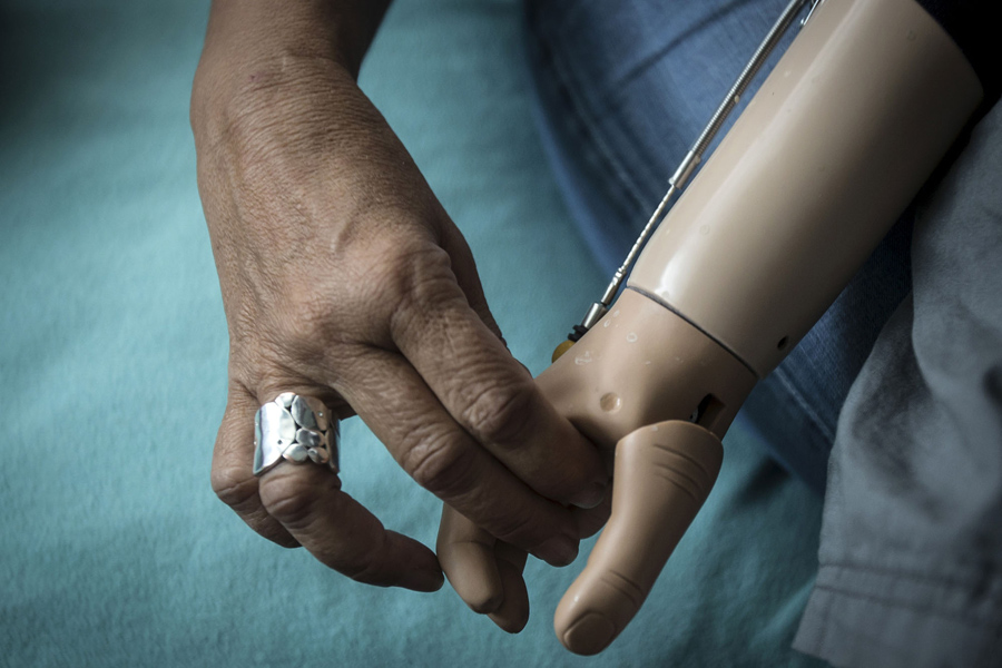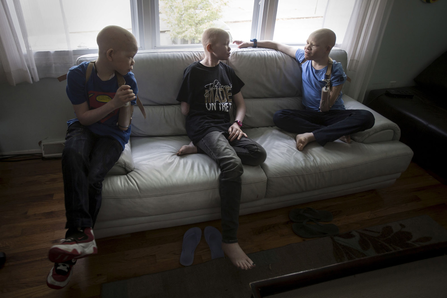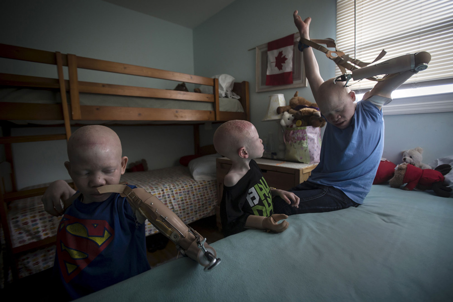 Read moreMwigulu Matonage, 12, (left) and Emmanuel Festo, 13, (right) put on their prosthetic arms as Baraka Cosmas,5, watches in their bedroom in New York on September 21, 2015. #