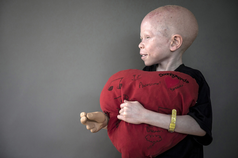 Read moreBaraka Cosmas, 5, poses with a plush heart that he says makes him feel safe at night and that he sleeps with, in New York on September 21, 2015. Baraka and three other Tanzanian children spent the summer in New York being fitted with prosthetic limbs and enjoying a few simple childhood joys like splashing in a pool and playing backyard soccer. But in the next few days they will return to Tanzania, where people with albinism continue to live in danger. #