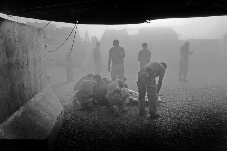 Read moreCanadian soldiers shelter a casualty outside a field hospital from a helicopter’s dust before moving him to a medevac for transport to Kandahar Airfield in Zhari District, Kandahar Province. #