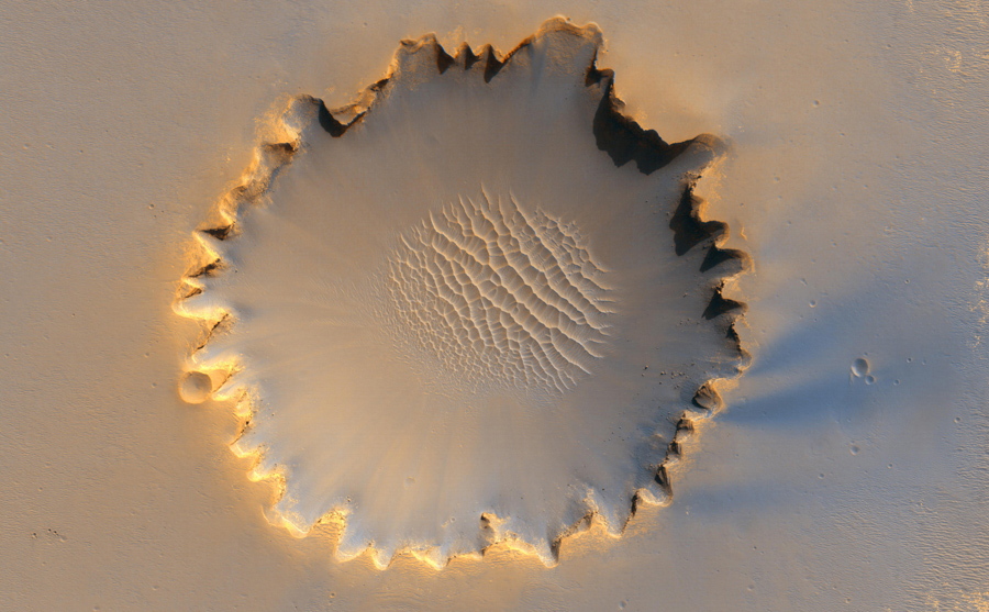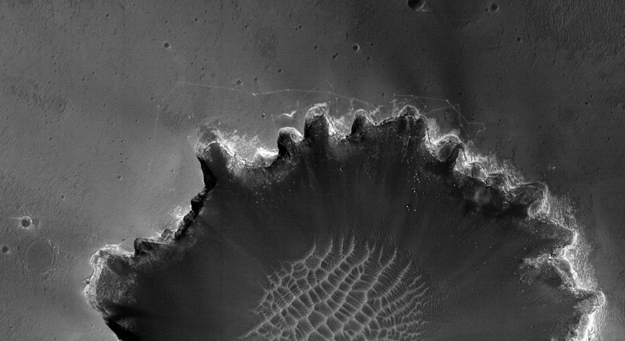 Read moreNASA's rover Opportunity visits Victoria Crater, viewed from orbit by the High Resolution Imaging Science Experiment on NASA's Mars Reconnaissance Orbiter in October of 2006. Opportunity is a small dot on the crater's lip, at top right. Opportunity first reached the crater's rim on September 27, 2006. #