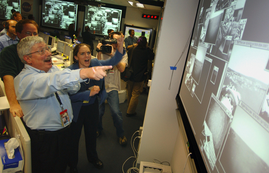 Read moreOn the day of Opportunity's landing—202 days after launch —Pete Theisinger, Project Manager, and Jennifer Trosper, Spirit Mission Manager for Surface Operations react as the first images arrive from the NASA Mars Rover Opportunity. #