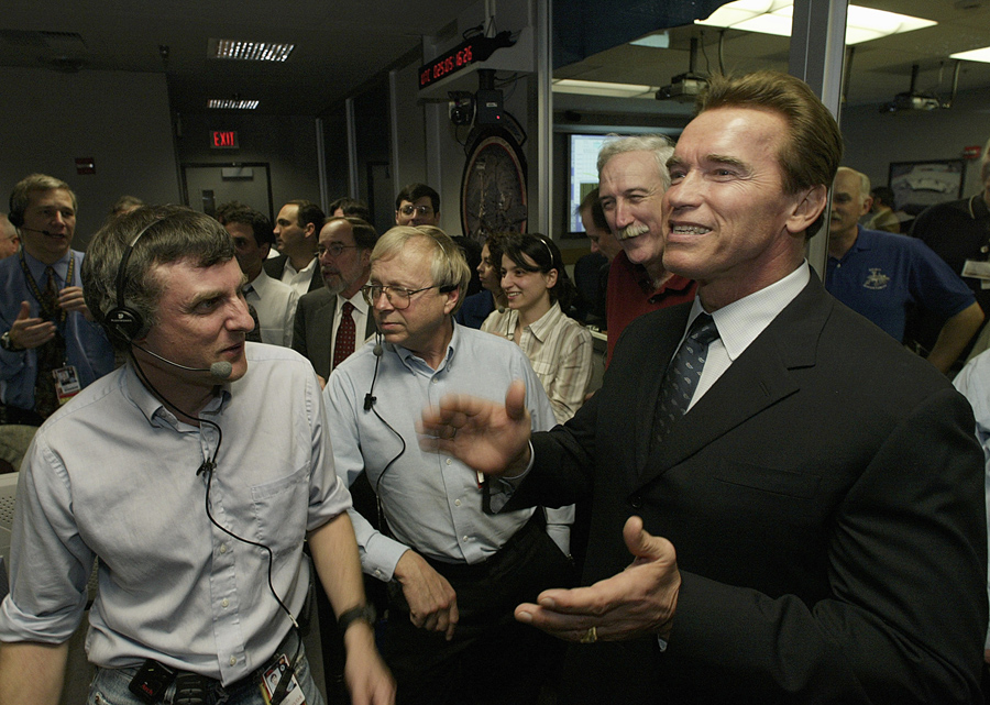 Read moreCalifornia Governor, Arnold Schwarzenegger cheers with Dr. Steve Squyres, principal investigator for Opportunity, and other Mars rovers team members in the Mission Control Center at NASA's JPL in Pasadena, California, on January 24, 2004, following the safe landing of the Opportunity rover on Mars. #