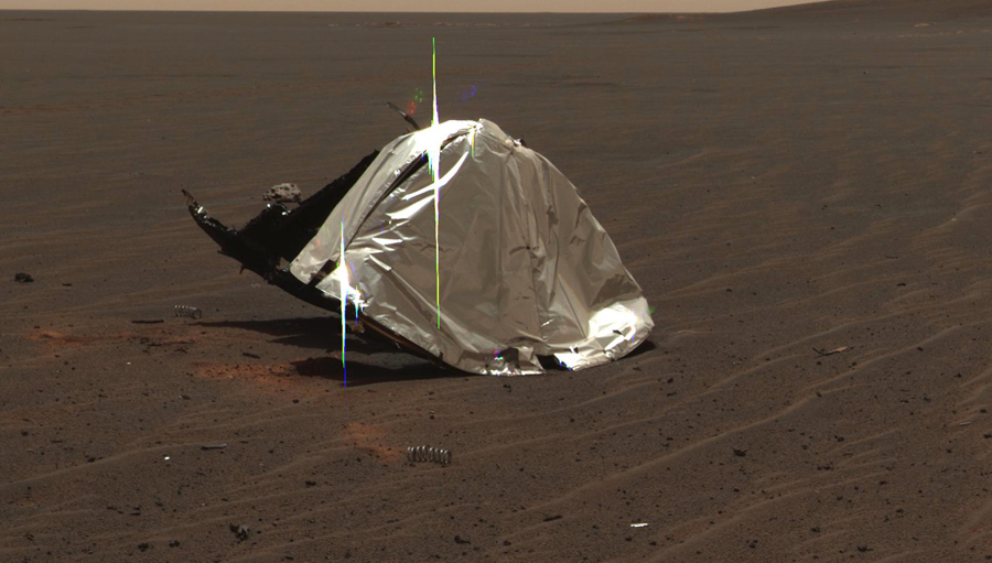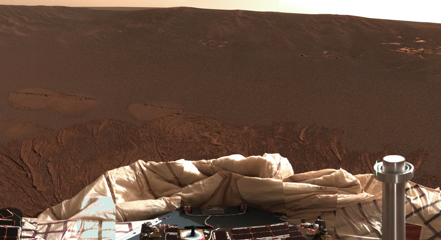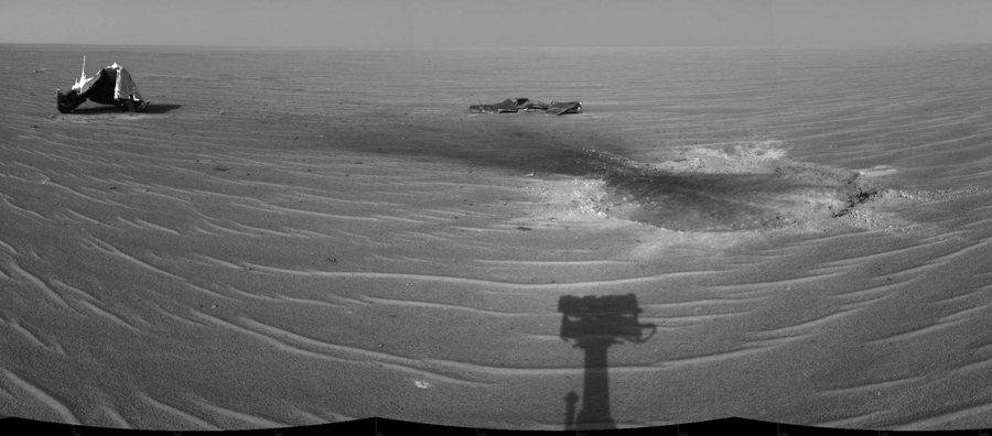Read moreOpportunity gained this view of its own heat shield during the rover's 325th martian day (December 22, 2004). The main structure from the successfully used shield is to the far left. Additional fragments of the heat shield lie in the upper center of the image. The heat shield's impact mark is visible just above and to the right of the foreground shadow of Opportunity's camera mast. #