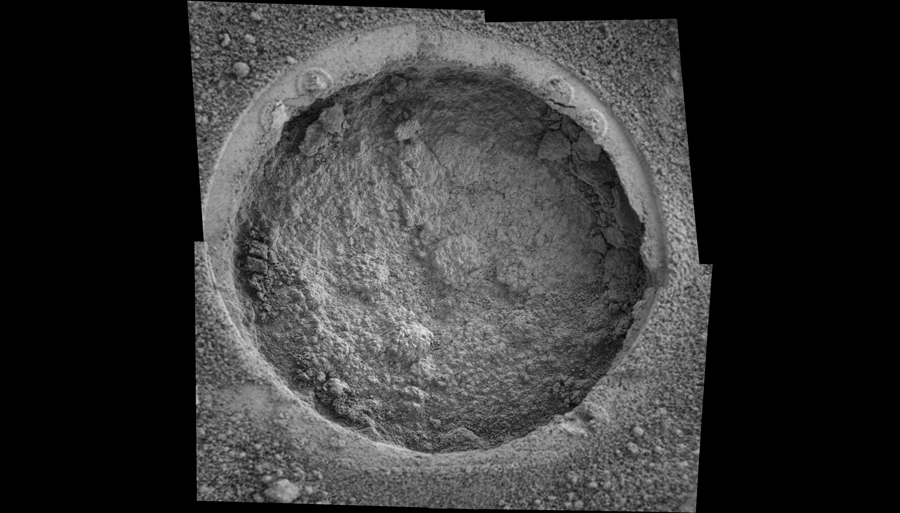 Read moreThis image taken by Opportunity shows a target dubbed “Campbell” on a rock called “MacKenzie” in “Endurance Crater.” Opportunity dug a hole into the target with its rock abrasion tool, then captured this picture with its microscopic imager on sol 184 (July 30, 2004). The image mosaic is about 6 centimeters (2.4 inches) across. #