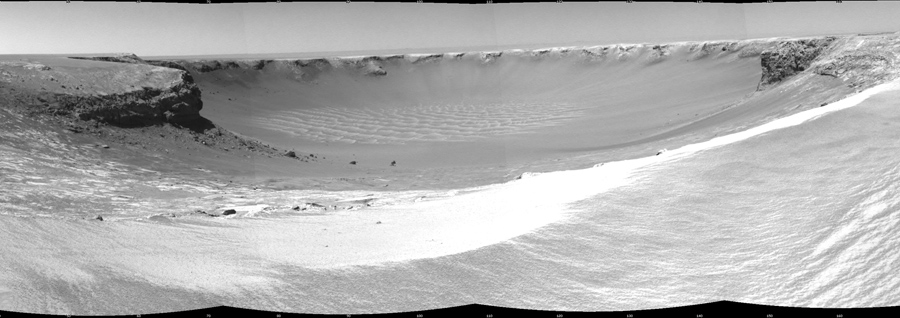 Read moreOpportunity edged close to the top of the “Duck Bay” alcove along the rim of Victoria Crater during the rover's 952nd Martian day, or sol (overnight September 27 to 28), and gained this vista of the crater. The rover's navigation camera took several exposures combined into this mosaic view of the crater's interior. The far side of the crater is about 800 meters (one-half mile) away. The rim of the crater is composed of alternating promontories, rocky points towering approximately 70 meters (230 feet) above the crater floor, and recessed alcoves, such as Duck Bay. #