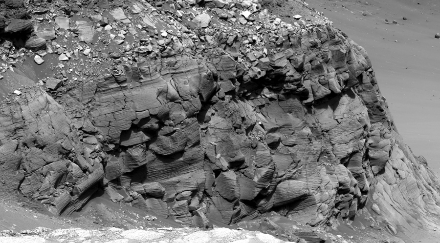 Read moreThe panoramic camera aboard Opportunity acquired this panorama of the “Payson” outcrop on the western edge of Erebus Crater during Opportunity's sol 744 (February 26, 2006). From this vicinity at the northern end of the outcrop, layered rocks are observed in the crater wall, which is about 1 meter (3.3 feet) thick. The view also shows rocks disrupted by the crater-forming impact event and subjected to erosion over time. #