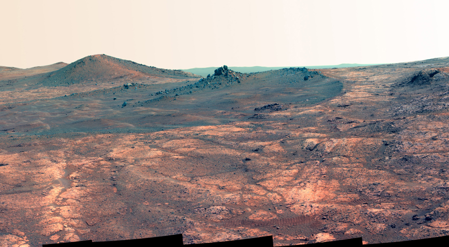 Read moreOpportunity catches its own late-afternoon shadow in a view eastward across Endeavour Crater on Mars. The rover used a panoramic camera between about 4:30 and 5:00 p.m. local Mars time to record images taken through different filters and combined into this mosaic view. The view is presented in false color to make some differences between materials easier to see, such as the dark sandy ripples and dunes on the crater's distant floor. #