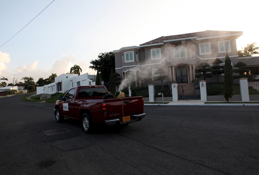 Read moreA pick-up truck from the Department of Health drives past fumigating the neighborhood to prevent the spread of Zika virus in San Juan, Puerto Rico, on January 27, 2016. #