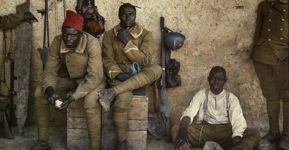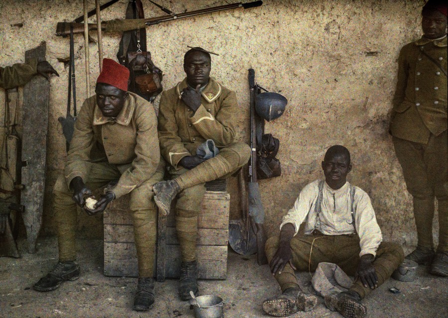 In his preface to The First World War: Unseen Glass Plate Photographs of the Western Front, Geoff Dyer writes: “The shock is not the shock of the new so much as the shock of the old made new—and the new made suddenly old.” The book, a curation by Carl De Keyzer and David Van Reybrouck, features high-resolution, expertly-restored photographs from the Western Front. Dyer’s dichotomy is at play in the image of four Senegalese soldiers below. Taken by Paul Castelnau, who himself served in the war, the image gives viewers a visceral sense of the subjects’ unique personalities—they are not generic soldiers from sepia-soaked history.