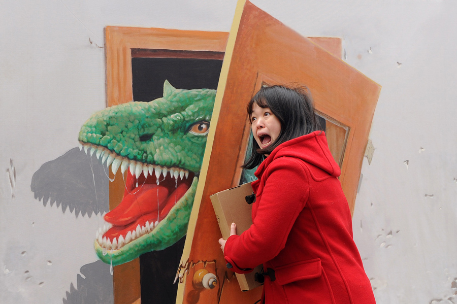 Read moreA woman poses with a trompe-l'oeil painting at Sanxia Square in Chongqing, China, on January 29, 2016. Trompe-l'oeil is an art technique that uses realistic imagery to create the illusion that depicted objects exist in three dimensions. #