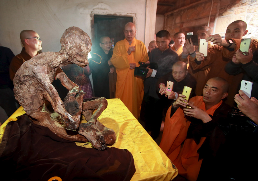 Read moreMonks take pictures with their mobile phones of the mummified body of a monk at Puzhao temple in Quanzhou, Fujian province, on January 10, 2016. According to local media, the monk named Fuhou died three years ago at the age of 94. His remains were placed in a vat and turned into a mummy as a sign of respect. #