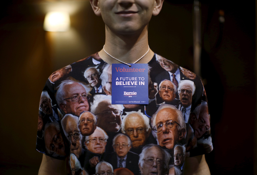 Read moreA volunteer at U.S. Democratic presidential candidate Bernie Sanders's campaign event wears a shirt decorated with Sanders's image in Fort Dodge, Iowa, on January 19, 2016. #