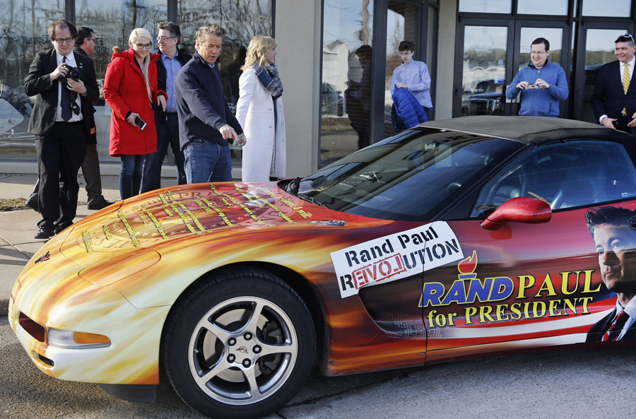 Read moreRepublican presidential candidate and Kentucky Senator Rand Paul points to a Corvette driven by a supporter before holding a town hall at the National Sprint Car Hall of Fame and Museum in Knoxville, Iowa, on January 29, 2016. #