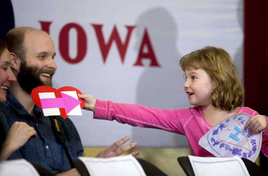 Read moreMagnolia Mandelko, 5, excitedly holds a campaign card and a drawing as she waits for Democratic presidential candidate Hillary Clinton, accompanied by her daughter Chelsea Clinton, to arrive at a rally at Abraham Lincoln High School in Council Bluffs, Iowa, on January 31, 2016. #